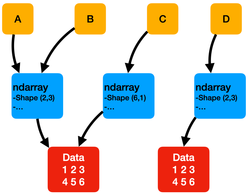 Ceine View aufA(z.B.C=A.reshape(6,1))AundCteilen sich die Daten, aber interpretieren diese Daten durch unterschiedliche Array-Strukturen (in diesem Fall unterschiedliche Formen)